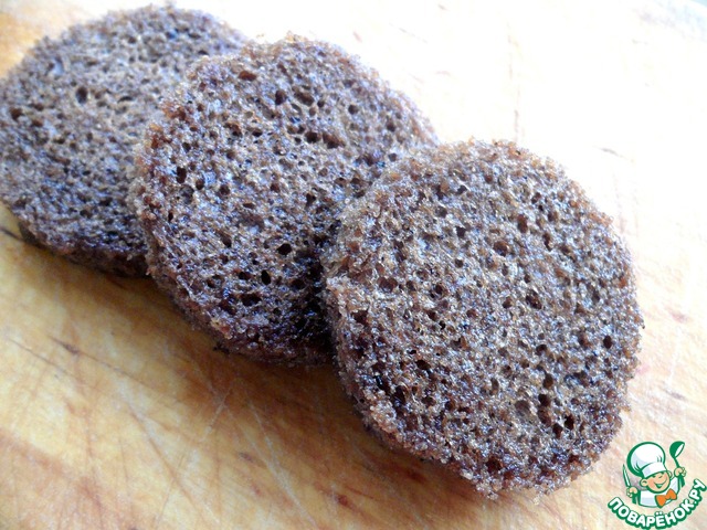 В это время вырезать кружочки Бородинского хлеба, обжарить на масле с двух сторон, охладить.