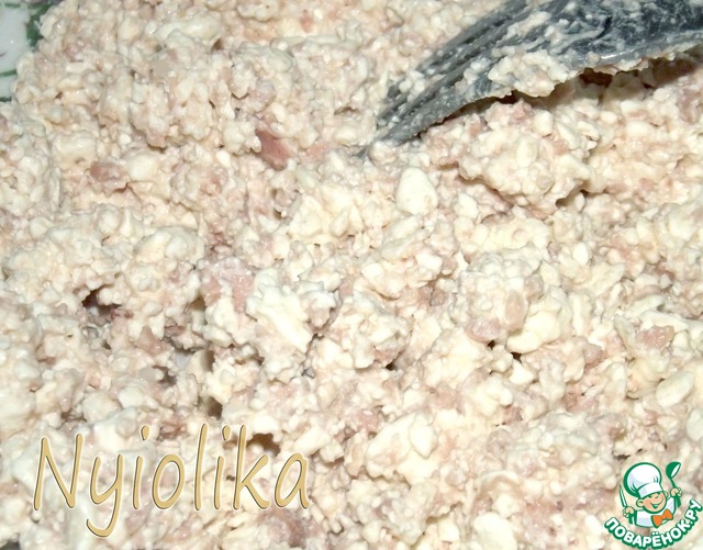 Смешать творог с печенью трески, слегка посолить (по вкусу)