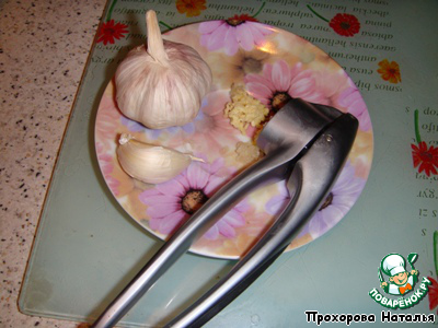 Тем временем готовим чесночок. Выдавить чеснокодавкой.