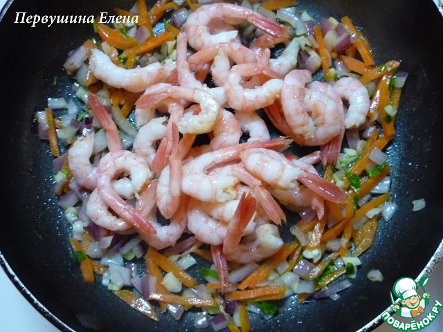 Уменьшить огонь и готовить креветки около 3-х минут, периодически встряхивая сковороду. Если креветки очень крупные, то время тушения немного увеличить.