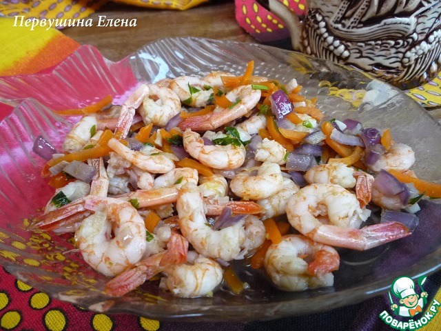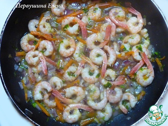 Выложить креветки на блюдо. Прибавить огонь и уварить жидкость до половины первоначального объема.