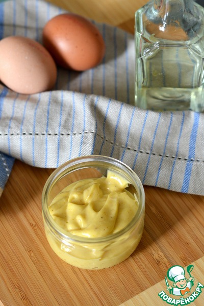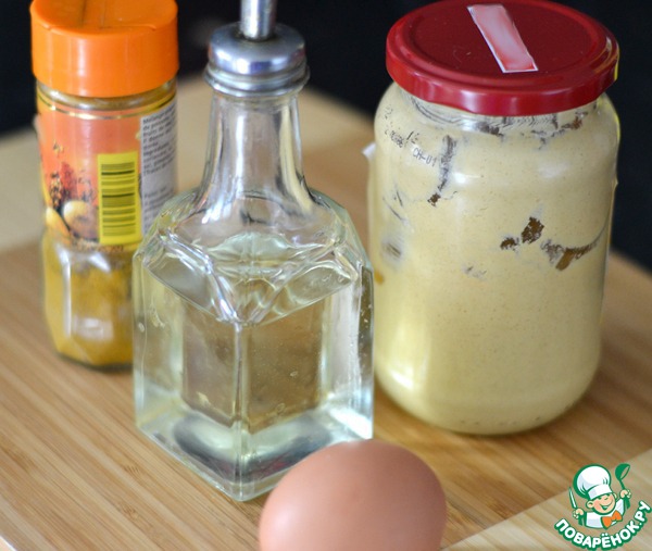 Ингредиенты для майонеза: масло растительное без запаха, яичный желток, соль, перец, горчица, лимонный сок, карри.