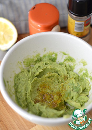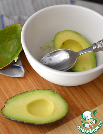 Теперь готовим крем из авокадо: авокадо очистить, нарезать, добавить лимонный сок и измельчить в пюре.