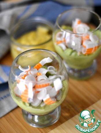Теперь сборка: в веррины положить крем из авокадо, сверху положить крабовые палочки. А затем украсить майонезом из карри и долькой лимона. Перед подачей хранить в холодильнике.