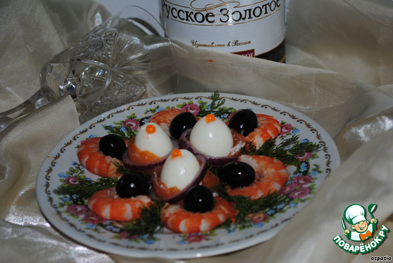 Вокруг наших окольцованных яиц укладываем креветки, маслины... и... подаем к столу!
