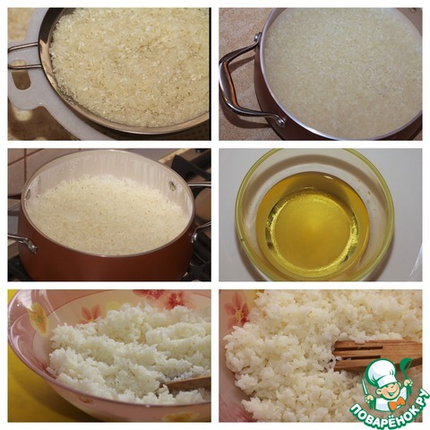Рис для роллов приготовила по этому рецепту: http://www.povarenok .ru/recipes/show/861 21/. Заправку делала в таком соотношении: к 2-м стаканам сырого риса добавить 5 столовых ложек рисового уксуса, 2 чайные ложки сахара и 1/2 чайной ложки соли. Нам потребуется 250-300 г подготовленного отварного риса с заправкой из рисового уксуса, сахара и соли.