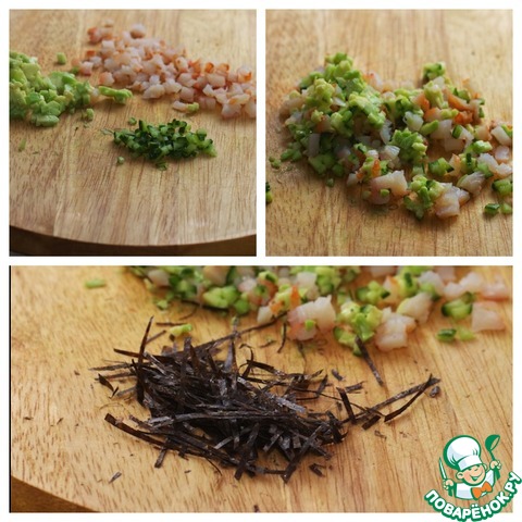 Нарезать кубиком размером с рисинку: креветки, авокадо, кожуру огурца. смешать. Разрезать лист нори ножом на полоски по перфорации. Максимально тонко нашинковать нори длинной соломкой.