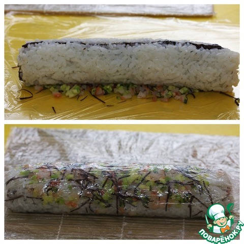 Скрутить ролл круглой формы. Выложить на пищевую пленку стружку нори, смесь креветки, авокадо и огурца.