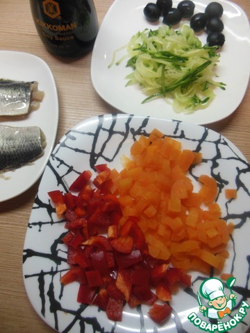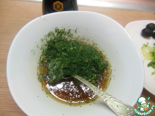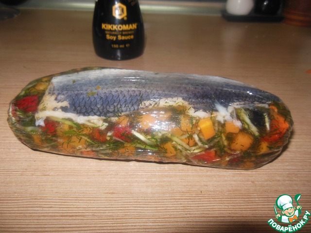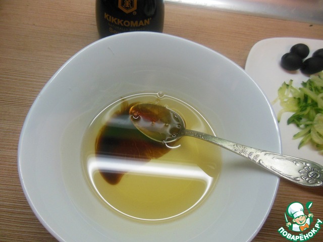 Делаем заливку. 1 ст. л. желатина разведём 125 мл. воды (если имеется рыбный бульон, то просто великолепно, берём его). Смотря какой у вас желатин - нужно его подогревать или нет, почитайте на упаковке... Далее в эту желатиновую воду добавим 1.5 ч. л. соевого соуса Kikkoman. Попробуйте на вкус, может понадобится больше, мне этого было достаточно.