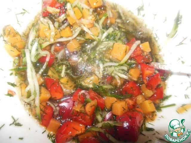 Морковь и перец нарежем кубиками, огурец натрём на тёрке по-корейски (если такой нет, можно нарезать соломкой).
