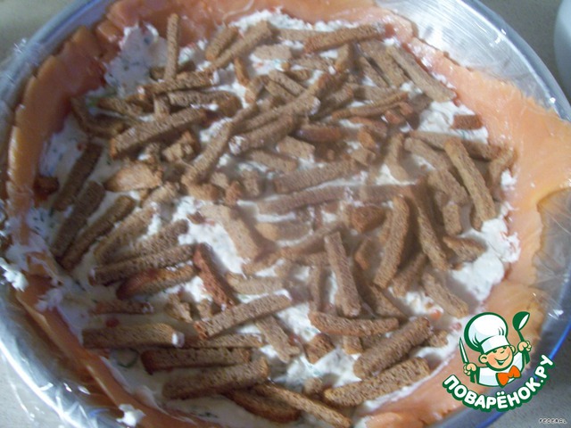 Всё это перемешать и выкладываем в блюдо с лососем, посыпаем сухариками,