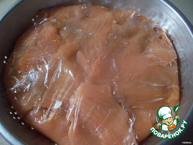 Выложить лосось в круглую, но не очень глубокую салатницу, застеленную пищевой плёнкой.