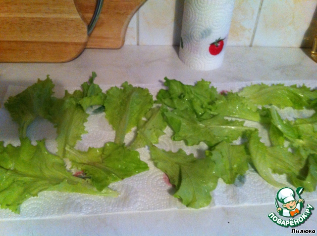 Вымыть листья салата и высушить на полотенце. Разложить их на тарелке, полностью закрывая дно.