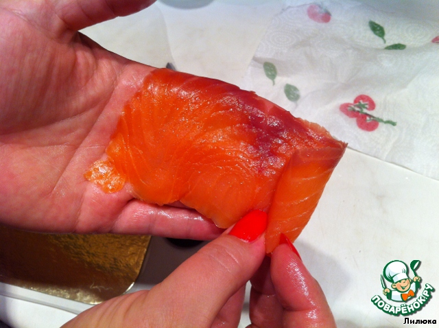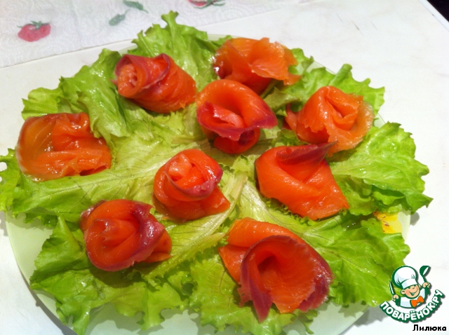 Готовые розочки выкладываем на листья салата в произвольном порядке.