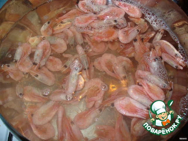 Креветки, если сырые, отварить в подсоленной воде. Если варено-мороженные (у меня такие), то разморозить. Я кинула на пару минут в кипяток.
