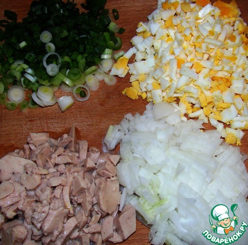 Измельчаем лук репчатый, лук зеленый, яйцо и печень трески.