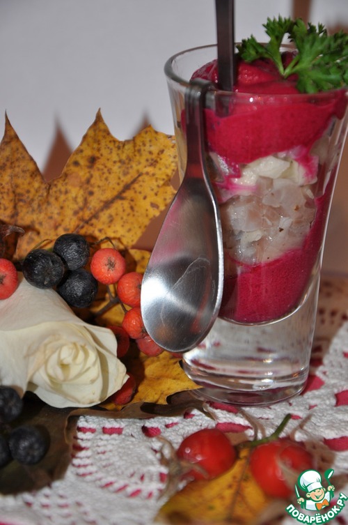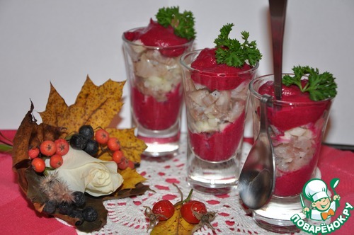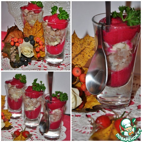 На дно бокалов выложить ложечку свекольного мусса, затем смесь сельди, лука и яблока. Сверху выложить свекольный мусс. Украсить веточками петрушки. Перед подачей желательно охладить в течение 30 минут.