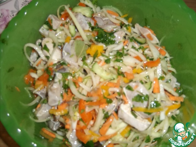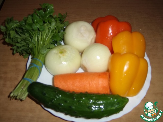 Пока рыбка маринуется, готовим овощи. Огурец, морковь и перец режем соломкой, лук - полукольцами, зелень измельчаем.