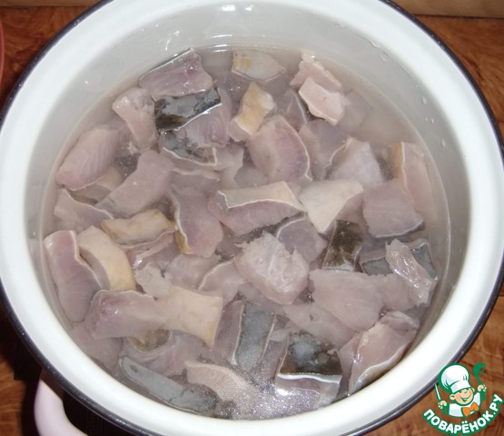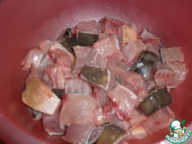 Рыбку хорошо вымыть, почистить, избавить от головы и внутренностей, вырезать хребет и нарезать на порционные кусочки, обязательно на коже.