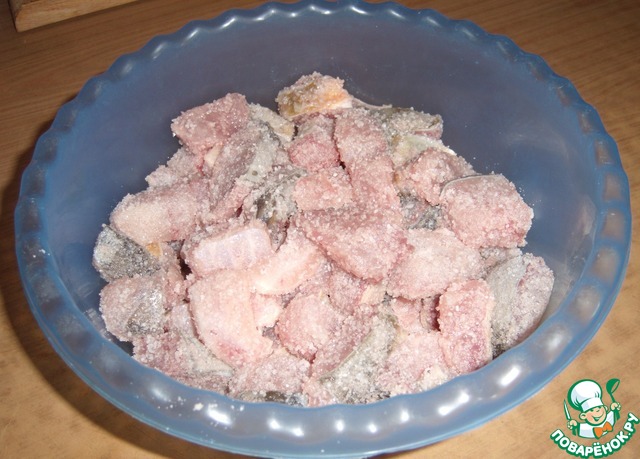 Затем берем нашу рыбку и солим ее как сало, т. е. хорошенько обваливаем каждый кусочек в крупной соли. Оставляем в теплом месте на 6 часов.