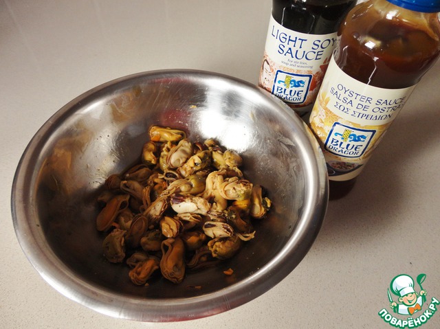 Оговорюсь, что вес мидий дан без учета жидкости. Итак, маринуем мидий в соевом и устричном соусе полчасика. Я использую соусы марки Blue Dragon.