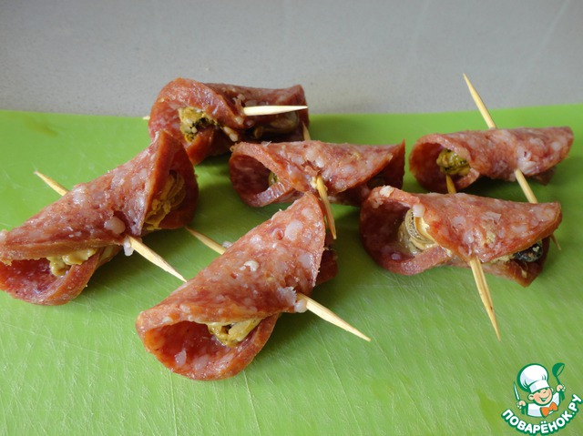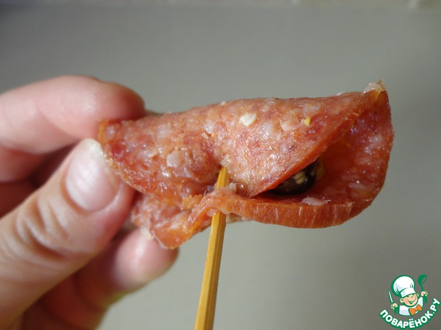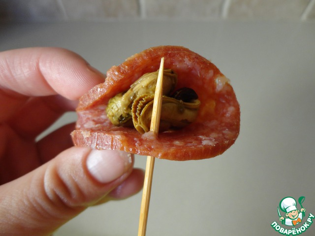 Затем берем кусочек салями, заворачиваем в него 2 мидии. Сначала прокалываем зубочисткой край колбасы с наружной стороны.