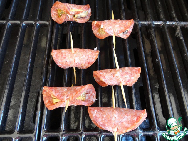 Обжариваем их на барбекю буквально по несколько секунд с каждой стороны. Если народу на пикнике много, то удобнее это сделать, выложив закусочку на решетку, которая закрывается сверху.