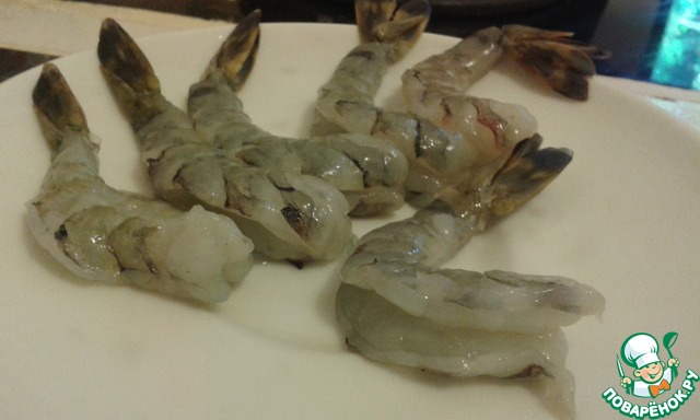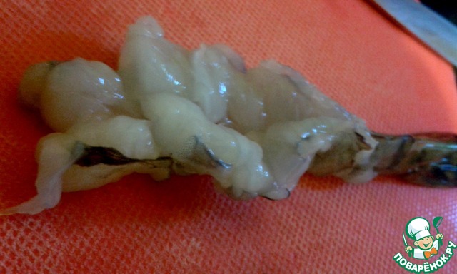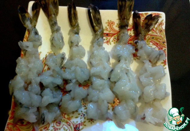 На спинке креветки делаем продольный разрез, не такой глубокий как на фото (у меня такие уже заготовленные специально для варки-жарки, чтобы закручивались красиво при приготовлении). Достаем кишку с отходами жизнедеятельности.