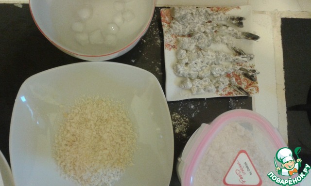 В воду (желательно воду заранее остудить в холодильнике) бросаем кубики льда, и пока они тают, охлаждая воду, валяем креветки в муке.