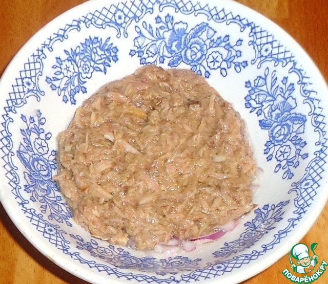 С консервированного тунца слить масло, размять вилкой и добавить к маринованному луку.