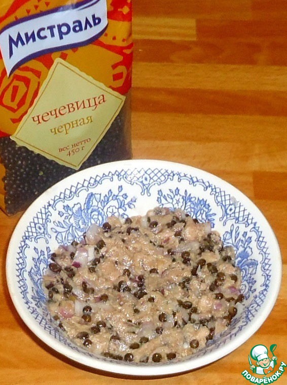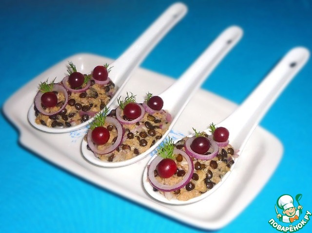 | Очень простая в приготовлении закуска из консервированного тунца, чёрной чечевицы и лука, будет красиво смотреться на праздничном столе. Предлагаю приготовить такую закуску на новогодний стол. Чёрная чечевица внешне очень похожа на чёрную икру, и ваши гости будут удивлены такой закуске. |
