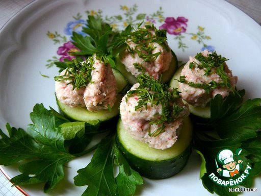 150 г мякоти копчeного лосося, 100 г творога, ~80 г сметаны, 1 маленький зубчик чеснока, свежий укроп, свежие огурцы