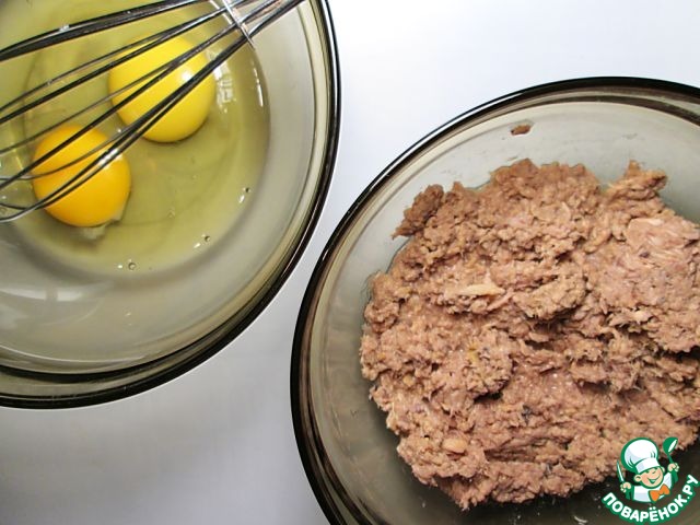 Тунец отжимаем от жидкости, разминаем вилкой, если он кусочками. Должно получиться 250 г мяса без жидкости. Яйца слегка взбиваем венчиком. Тунец можете взять и в масле, но тогда, само собой, блюдо будет куда жирнее и калорийнее.