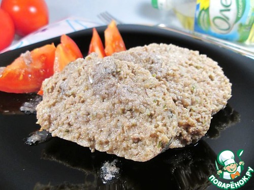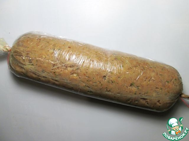 Отрезаем кусок пищевой пленки 30 на 40 см, выкладываем на нее "фарш", формируем цилиндр и заворачиваем в пищевую пленку, концы которой крепко сжимаем и завязываем ниткой. Кладем "колбасу" в кастрюлю, заливаем холодной водой, нагреваем на небольшом огне до кипения и кипятим 20 минут. Извлекаем готовую "колбасу" из воды, даем ей немного остыть, после чего ее уже можно подавать к столу.