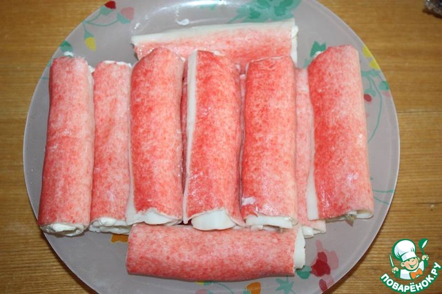 | Крабовые палочки, фаршированные сливочным сыром и шпротами. Сегодня у меня день рождения. Выложу сегодня парочку фоторецептов. Эта закуска - чистый экспромт. Экспромт, надо сказать, очень удачный. Зашли на ура. |