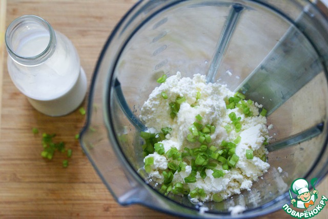 Взбить в блендере рикотту со сливками, добавив туда чайную ложку хрена, сок половинки лимона и нарезанный зеленый лук.