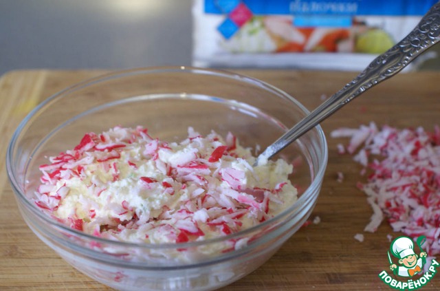 Закуска имеет нежный сладковатый вкус за счет крабовых палочек и миндаля, с пикантной, еле уловимой ноткой хрена и зеленого лука. Такое сочетание будет хорошо и для крабового мяса - ни один продукт здесь не перебьет его собственный вкус, а только выгодно его подчеркнет.