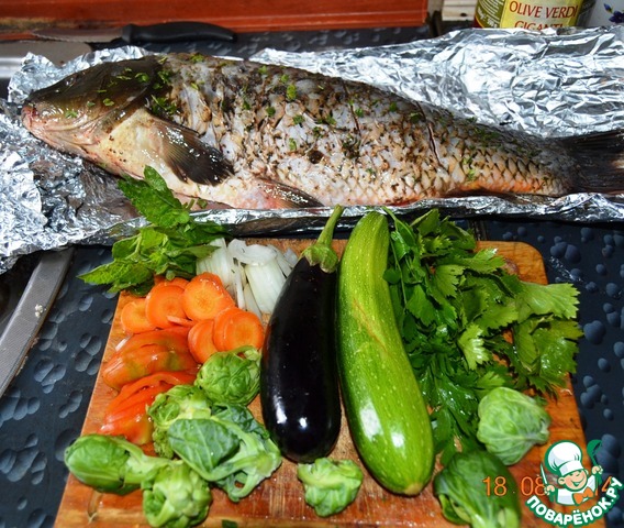 Положить карпа, во внутрь заложить оставшиеся овощи