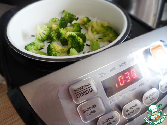Броколи отварить. Я готовила на пару в моей дорогой помошнице-мультиваро чке. После этого брокколи мелко порезать. Знаю, что для нее это вредно, но готовить с крупными соцветиями не получится.