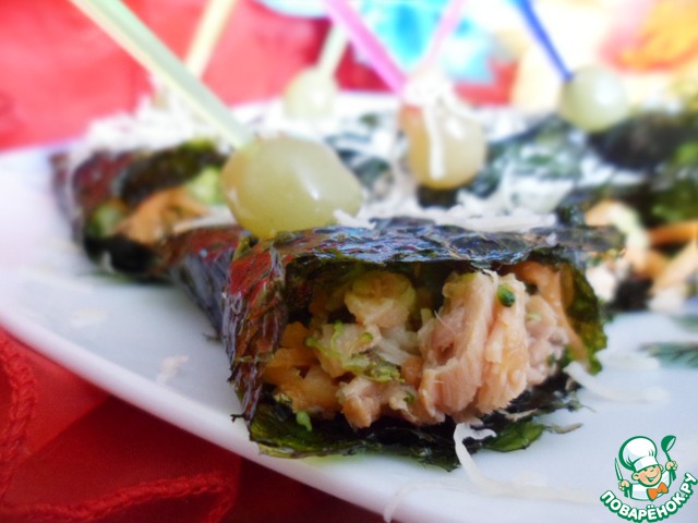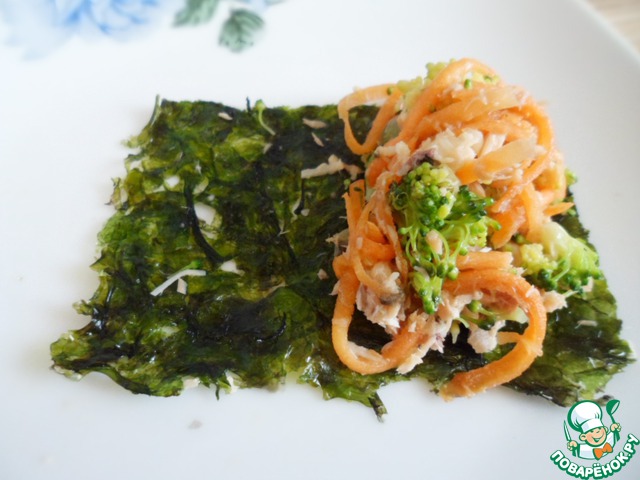 Теперь, формируем, собственно, закуску:)Нам нужна сушеная морская капуста, та которую используют для приготовления роллов. Моя ошибка-я взяла маленькие листочки, а не помешали бы побольше. Мне пришлось заворачивать в 2 листка, чтоб сильно не промокли. Вобщем на лист капусты выкладываем ложку получившегося салата;если как у меня-листочки маленькие, то кладем внахлест второй листик и сворачиваем. Закрепляем шпажкой или зубочисткой.