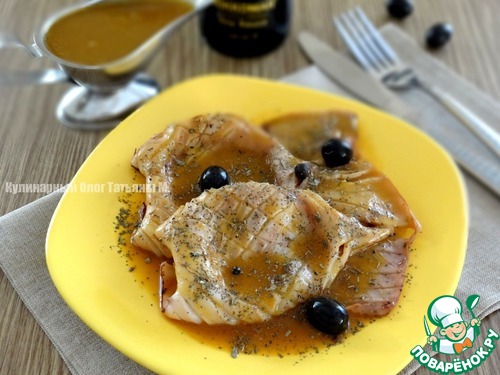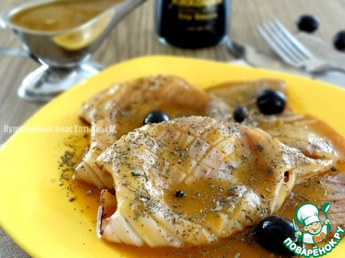 Выложить кальмаров на тарелку, обильно полить соусом, посыпать базиликом и дополнить маслинами;