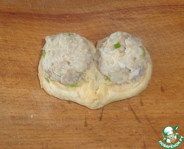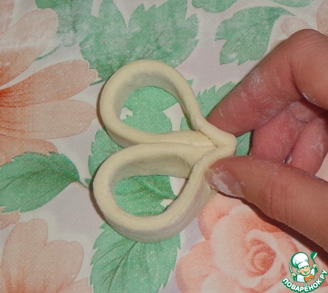 Слоеное тесто раскатать и порезать на полосочки. Сворачиваем каждую полоску как показано на фото.