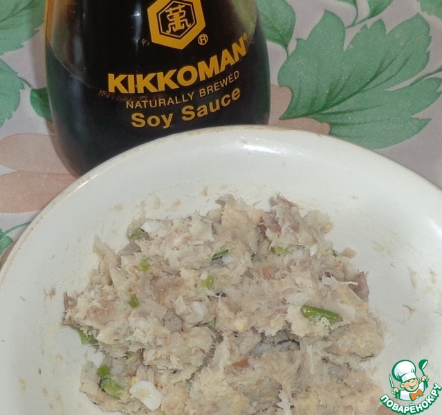 Рыбное филе хорошо размять и соединить с соевым соусом Kikkoman по вкусу. Добавляем зеленый лук.