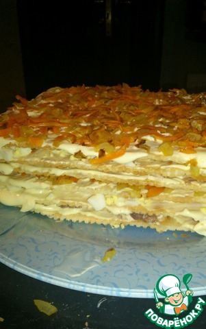 Коржи слоеные для торта "Наполеон" промазываем майонезом. Сайру разминаем вилкой, слив жидкость. Морковь и лук (большие или по 2 средних) пассеруем. Яйца отвариваем.