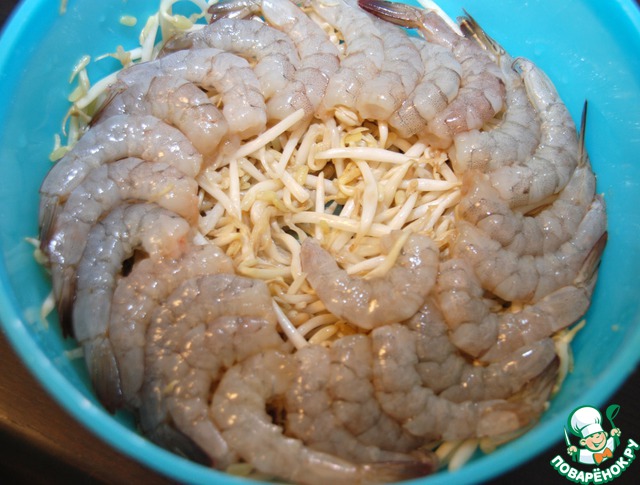 Ростки промыть и уложить на дно плоской посуды с высокими стенками. Сверху уложить креветки.