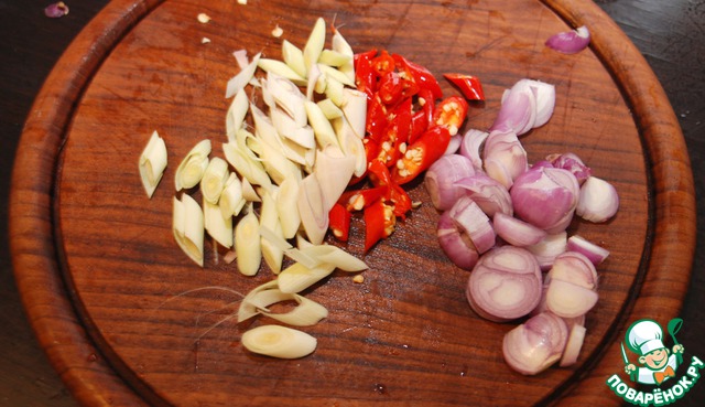 Нарезать лук, чили и лемонграсс. Mожно добавить чеснок и другой травы по вкусу.