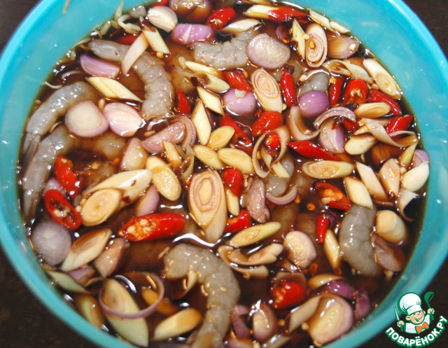 Маринад: смешать воду, соевый соус и рыбный соус. Если рыбного нет, то соевого должно быть 2 части, я еще добавилa сухой чили, но будет очень остро.