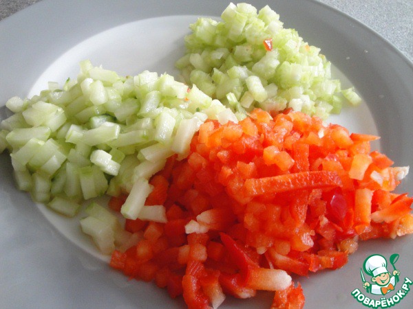 Перец и огурец очистить от шкурки и семян ( у огурца удалить их с помощью ложки). Нарезать маленькими кубиками. Сельдерей так же нарезать.