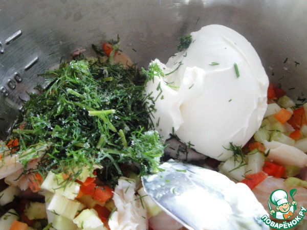 Перемешать рыбу и овощи. Добавить нарезанный укроп, сметану, перец черный. Если нужно посолите.