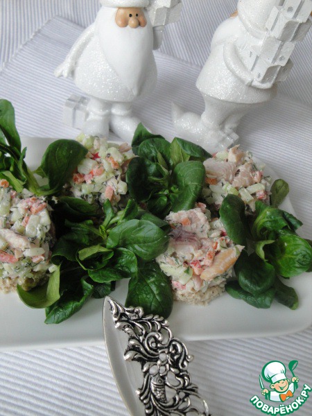Хлеб нарезать на маленькие кусочки и немного подсушить в духовке или на сухой сковороде. (В место хлеба можно так же использовать крекеры или просто кружочек огурца.)Выложить татар на хлеб. ( я это сделала с помощью кольца)